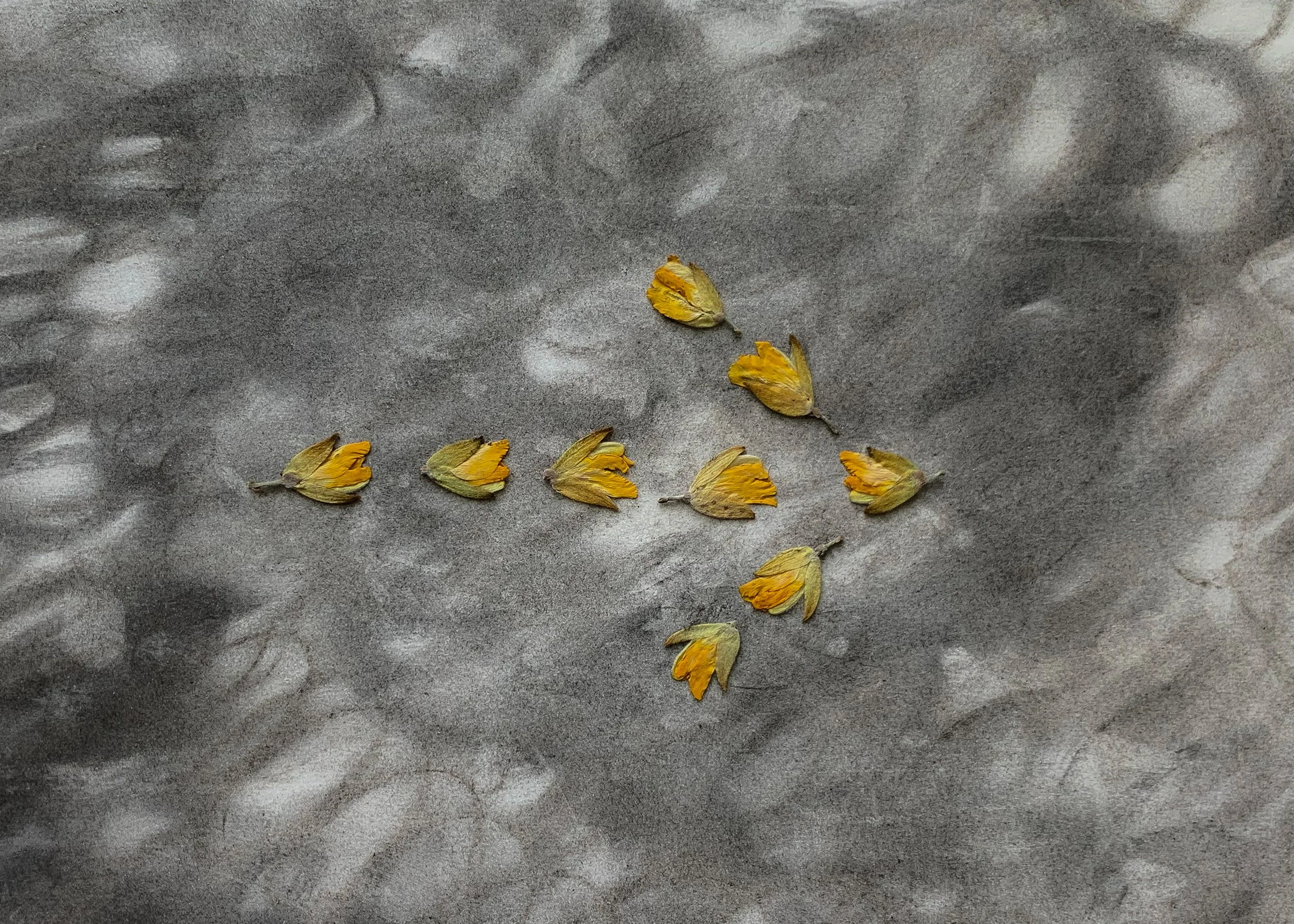 the balance, a cloud drifts across the sun and changes our moodGorse flowers, pressed and laid out in the shape of an arrow, an